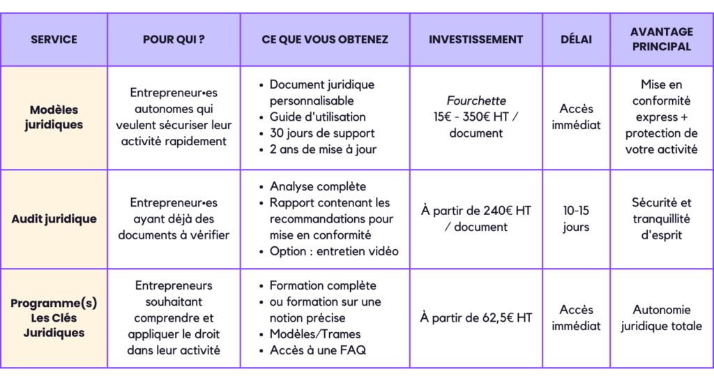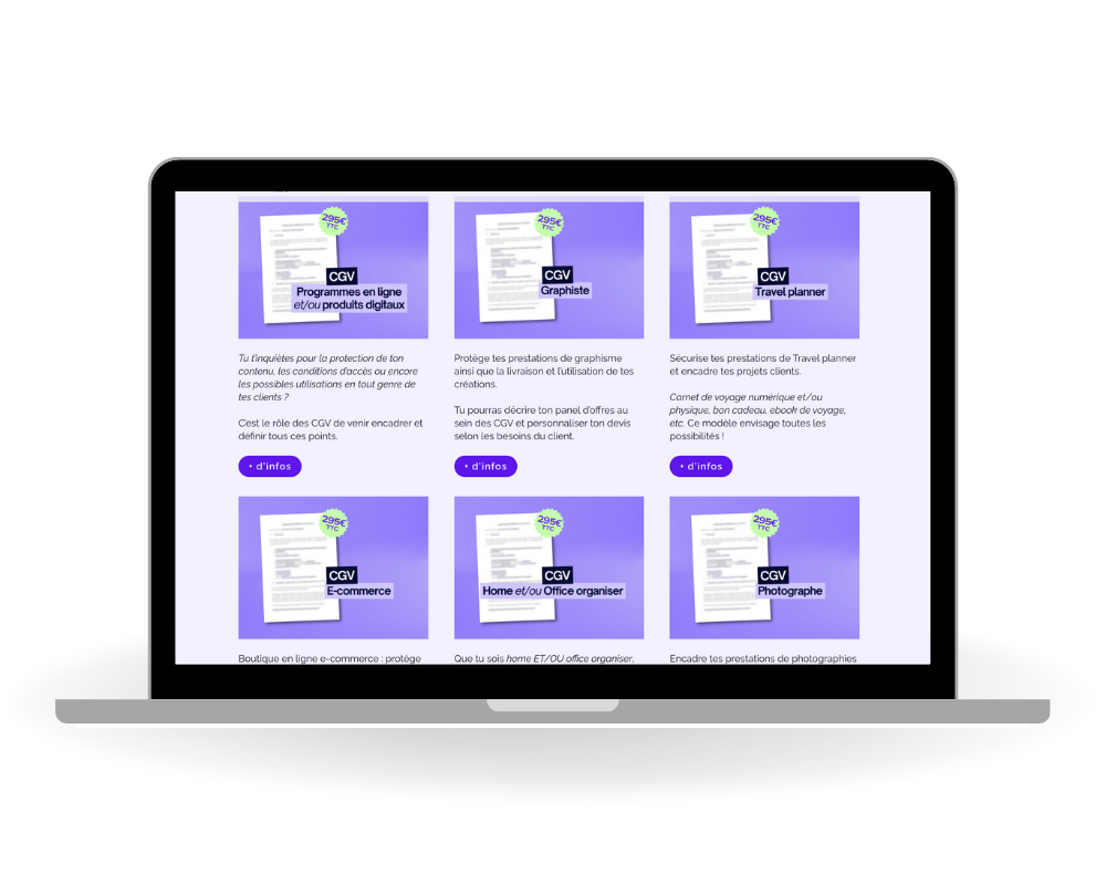 Obtienez des documents juridiques rédigés par une professionnelle du droit, conformes à la législation actuelle et prêts à être personnalisés pour votre entreprise.